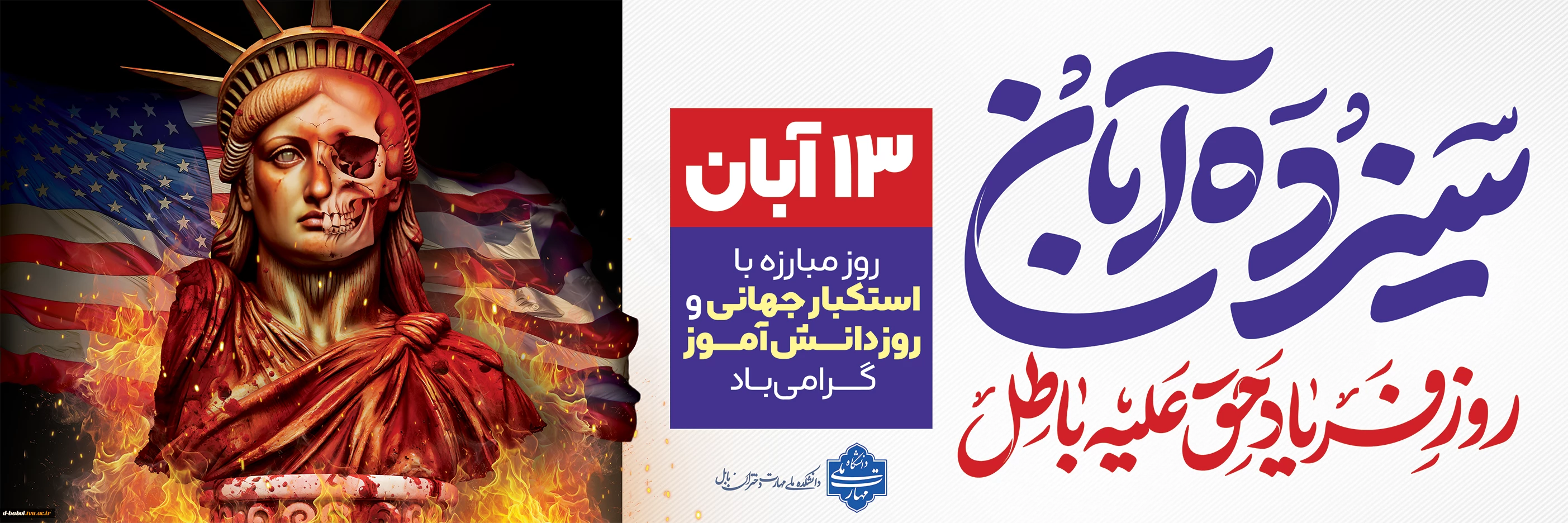۱۳ آبان سالروز یادآور سه رویداد تاریخی مهم؛ تبعید بنیانگذار انقلاب حضرت امام خمینی (ره) در سال۱۳۴۲، شهادت دانش آموزان توسط رژیم طاغوت در سال ۱۳۵۷ و تسخیر لانه جاسوسی استکبار جهانی به دست دانشجویان پیرو خط امام در سال ۱۳۵۸ می باشد.