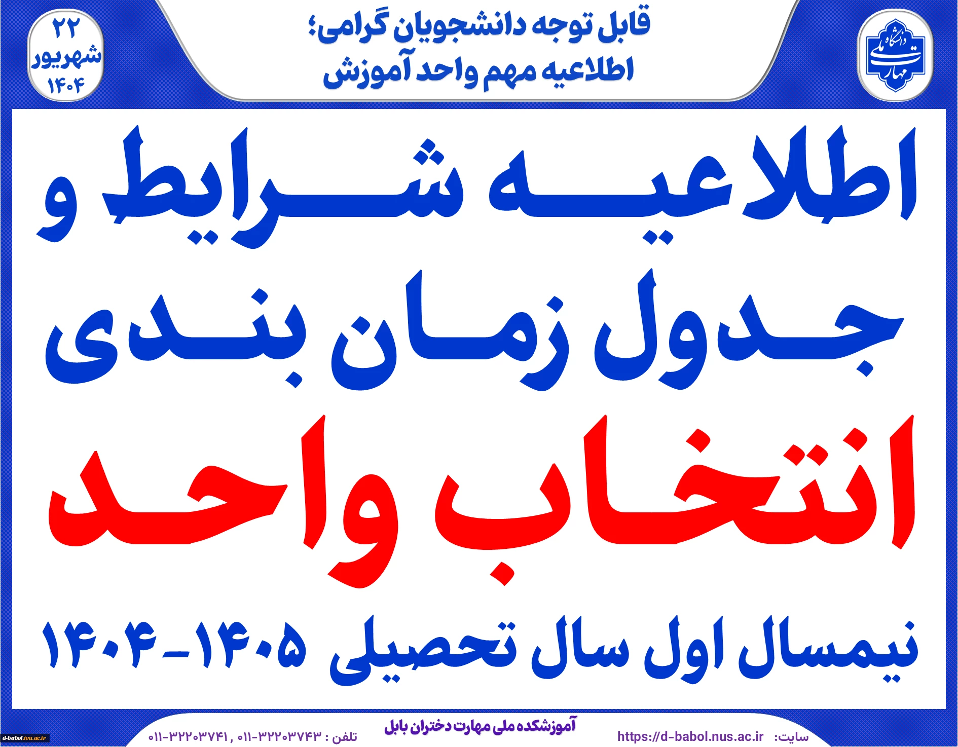 امتیاز دهید : اطلاعیه شرایط و جدول زمانبندی انتخاب واحد نیمسال اول سال تحصیلی 1405-1404 2 یکشنبه 23 شهریور 1404 ساعت 8:53