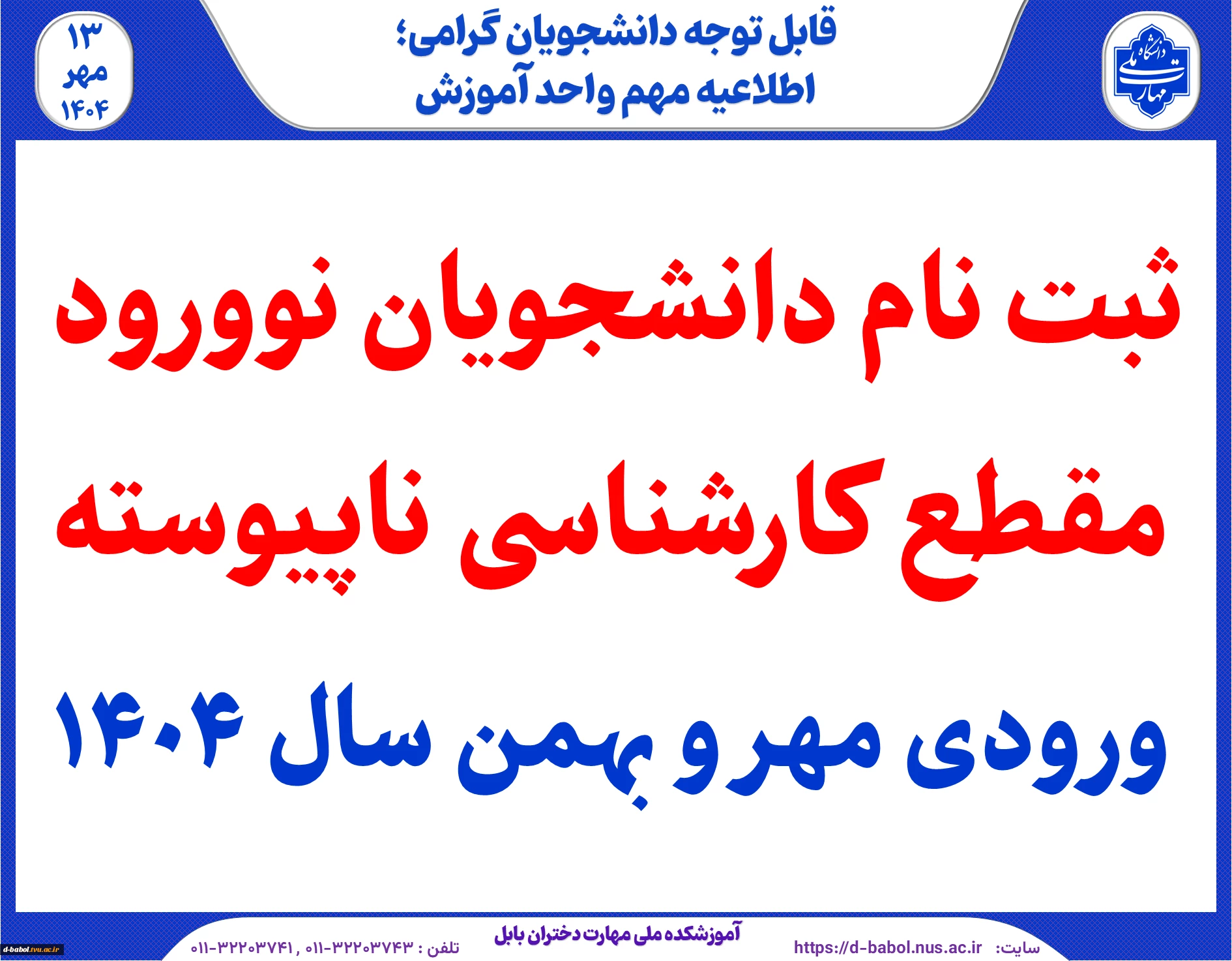امتیاز دهید : ثبت نام دانشجویان نوورود مقطع کارشناسی ناپیوسته ورودی مهر و بهمن سال 1404 2 یکشنبه 13 مهر 1404 ساعت 12:27
