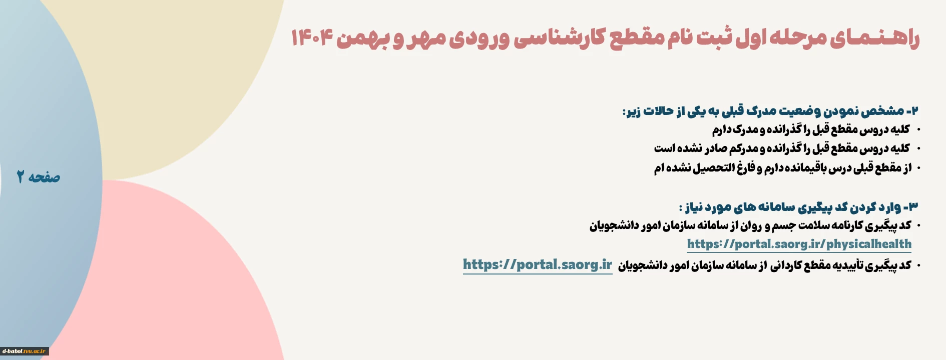 امتیاز دهید : ثبت نام دانشجویان نوورود مقطع کارشناسی ناپیوسته ورودی مهر و بهمن سال 1404 8 یکشنبه 13 مهر 1404 ساعت 12:27