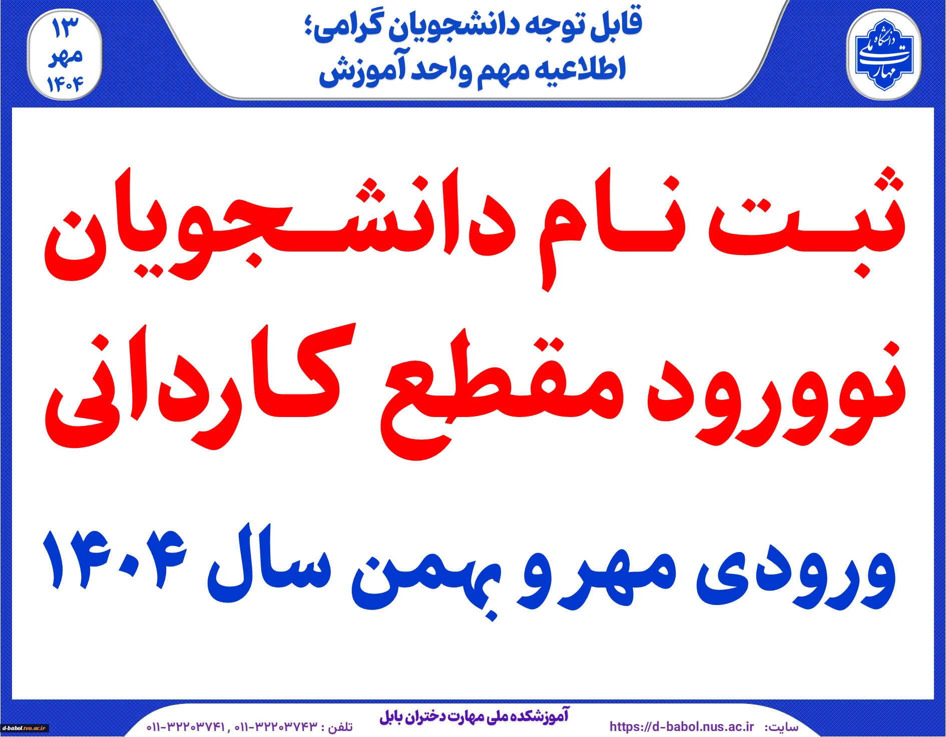 امتیاز دهید : ثبت نام دانشجویان نوورود مقطع کـاردانی ورودی مهر و بهمن سال 1404 2 یکشنبه 13 مهر 1404 ساعت 12:49