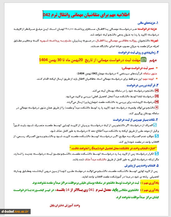 دانشجویان متقاضی مهمان یا انتقال به سایر مراکز دانشگاه ملی مهارت در نیم‌سال دوم  سال تحصیلی 1۴۰۴/۱۴۰۵  (بهمن_ ۰۴۲)